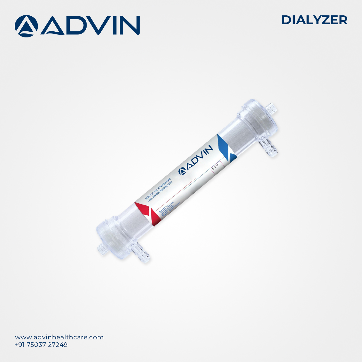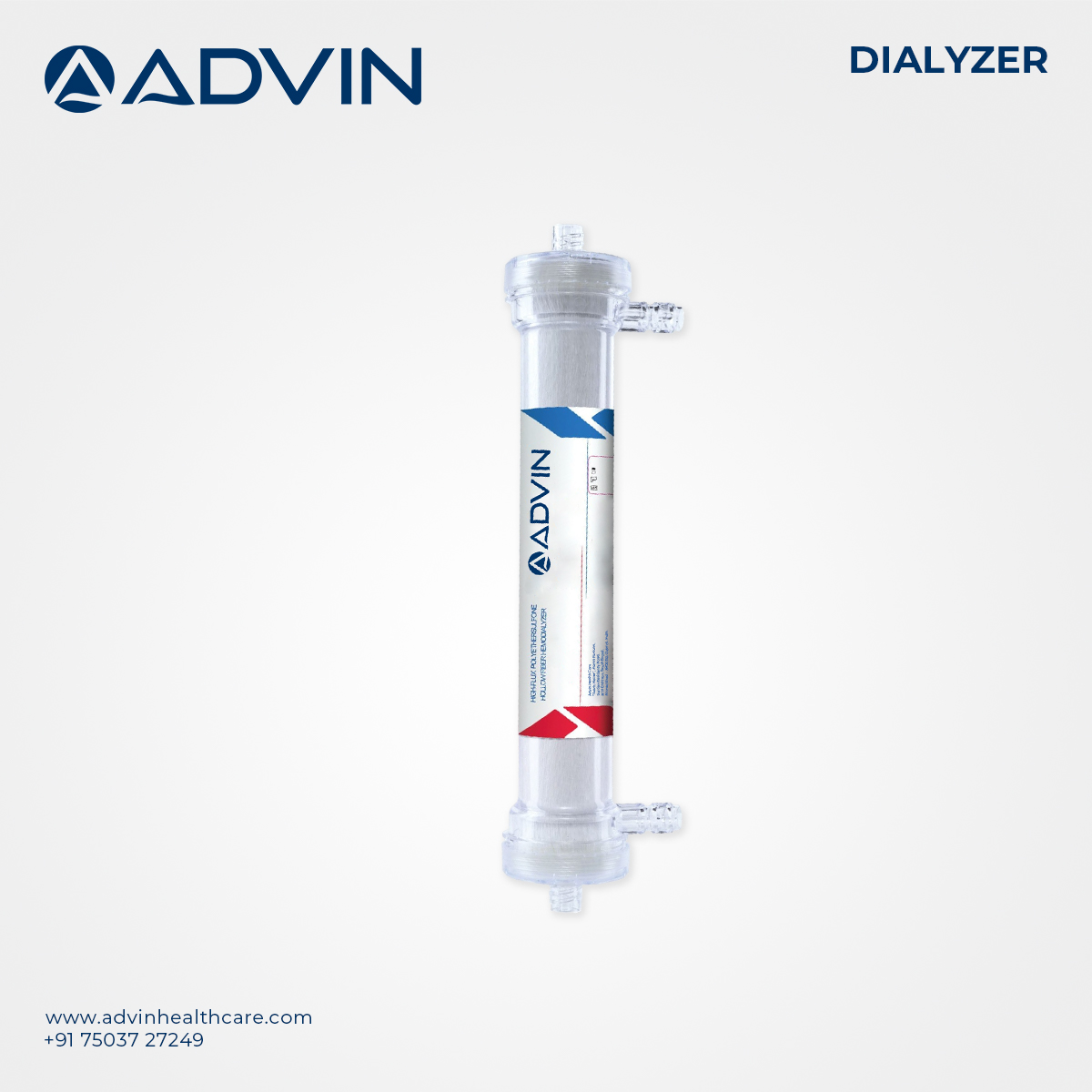 Advin Dialysis Dialyzer is a high-efficiency blood purification device designed to remove toxins, excess fluids, and waste products from the bloodstream during hemodialysis treatment.