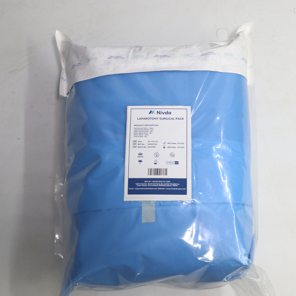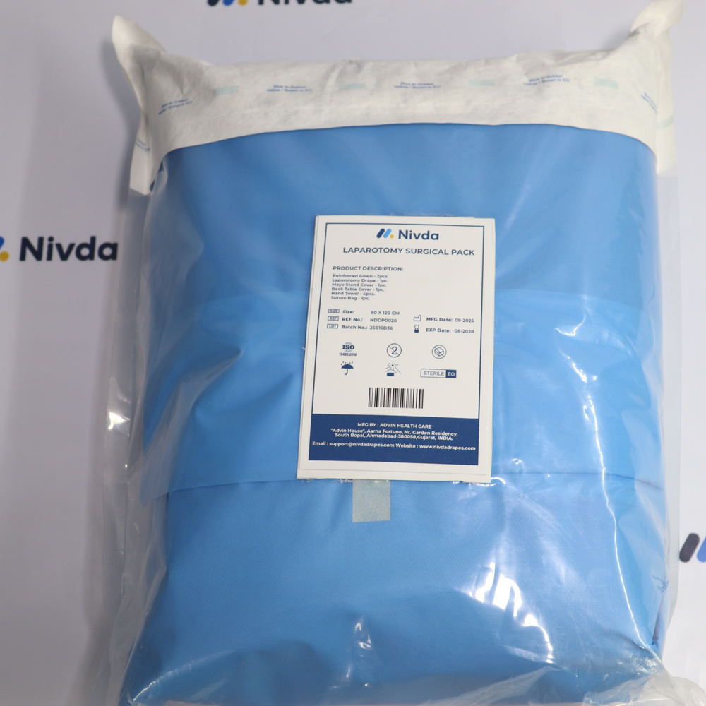 Laparotomy Drape Kit is designed to provide dependable coverage during procedures that require wide exposure of the abdominal area. The layout allows clear access to the operative site while protecting surrounding surfaces and equipment from fluids and contact. Nivda Drapes follows strict manufacturing standards to ensure consistent quality and reliable material performance. These drapes support infection control, improve operating room efficiency, and contribute to safer outcomes in major open surgical procedures.