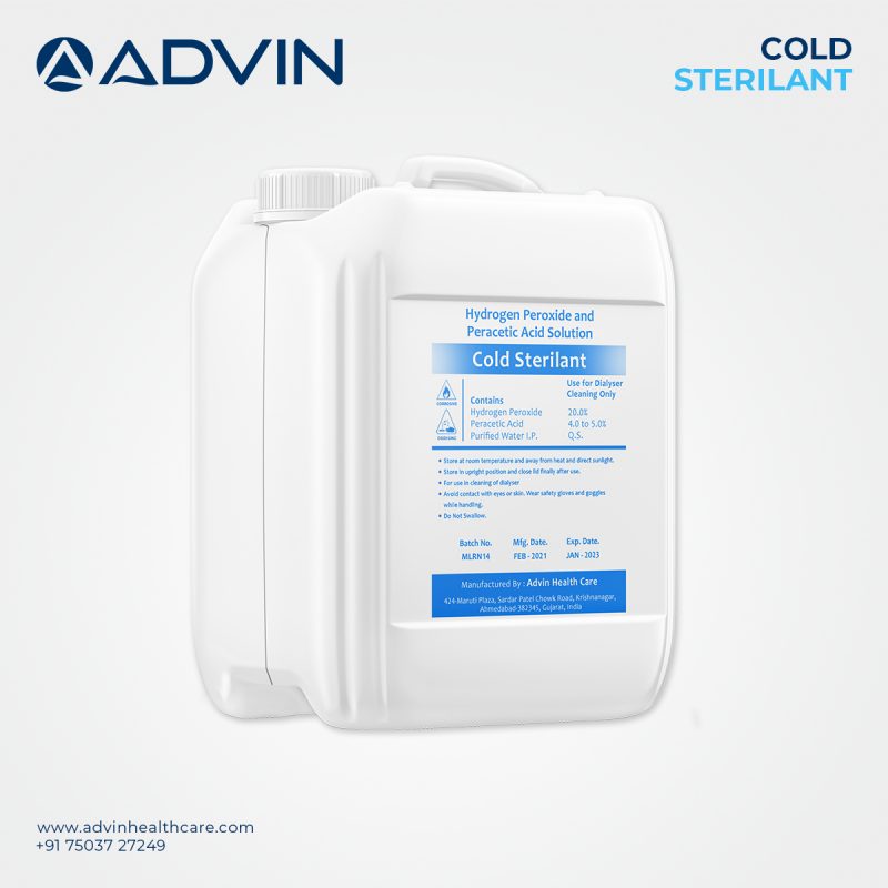 The Advin Dialysis Cold Sterilant is a specialized chemical disinfectant used in the reprocessing of dialyzers and dialysis-related instruments. It is engineered for high-level disinfection at room temperature, offering an effective alternative to heat-based sterilization.
