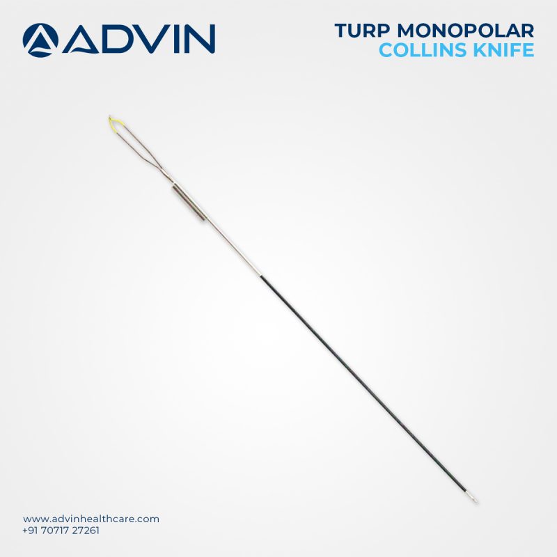 The Monopolar TURP Collins Knife is a specialized electrode used during TURP (Transurethral Resection of the Prostate) procedures to make precise cuts in the prostate tissue. Manufactured by Advin Health Care, this tool is known for its fine cutting performance and compatibility with standard monopolar resectoscope systems. It enables surgeons to perform accurate incisions with minimal tissue damage, contributing to smoother procedures and improved patient outcomes. Its robust construction and sharp cutting edge ensure reliability and efficiency during urological surgeries.